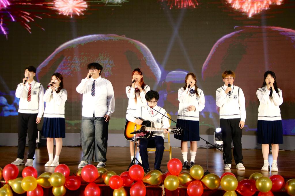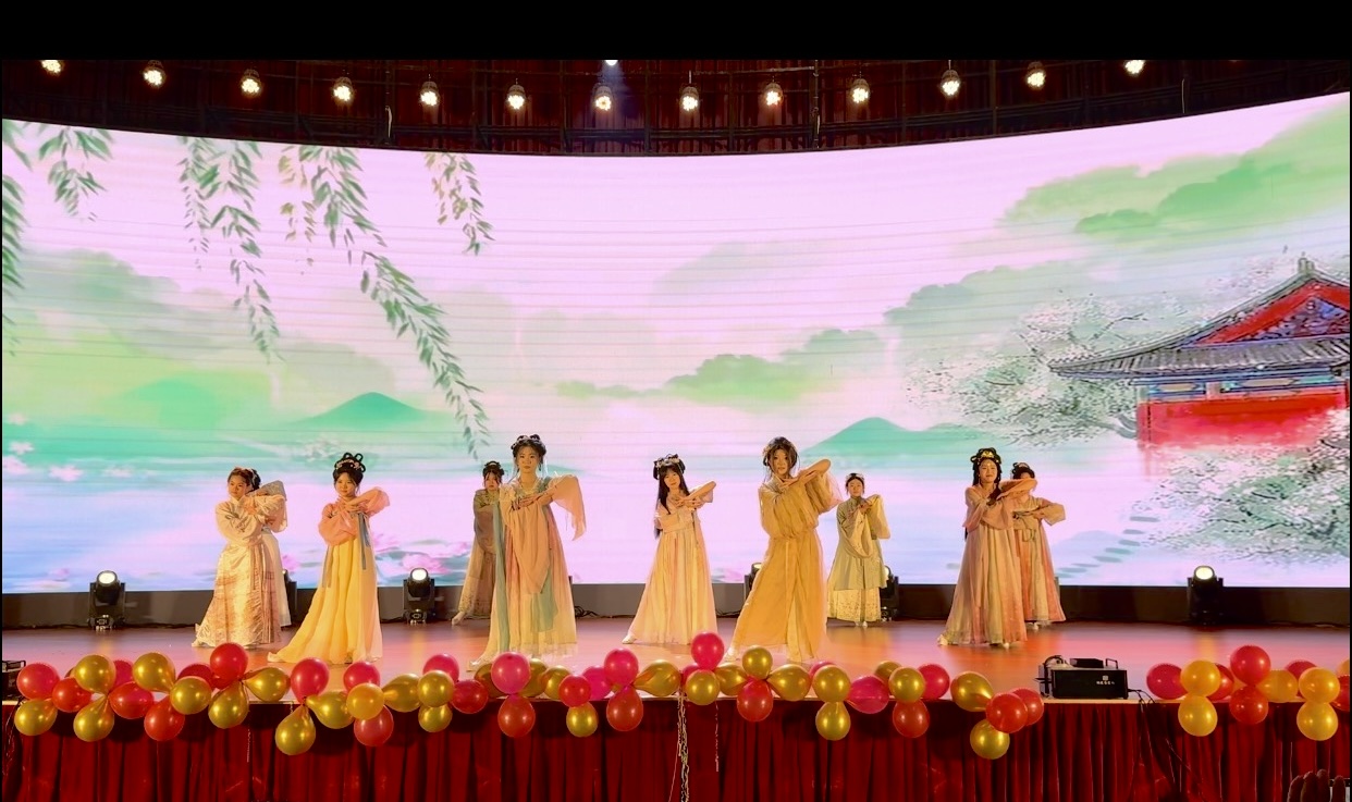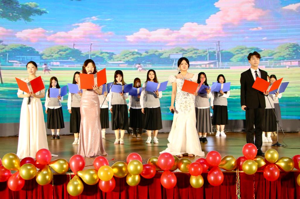 晚会分为“初遇·恰逢时”“此刻·正闪耀”“逐光·向未来”三个篇章,包含歌曲、舞蹈、相声、音乐剧等15个形式多样、各具特色的节目。晚会在活力四射的开场舞《Gee》中热烈开场,瞬间点燃了现场气氛。歌曲《我相信》、《你从未离去》旋律动人,唱出了学子们追逐梦想的坚定信念;舞蹈《River》、《沁莲》各展风采,展现出多元舞蹈风格的碰撞与交融;说唱《岁序新Flow》节奏明快、充满力量,彰显了当代青年的个性表达;朗诵《回望浴血路青春赴征程》、《新程有光青春不打烊》语调铿锵、感情真挚,学子们以昂扬之态诠释责任担当,勾勒对未来的美好憧憬;汉服表演韵味悠长,呈现出传统服饰与古典舞蹈的独特魅力;相声《欢声笑语》妙语连珠,引得台下笑声与掌声不断;cos表演造型惊艳,点燃了全场观众的二次元热情;晚会还特别设置了年度优秀学生表彰环节,对2025年在各项专业竞赛、社会实践等方面表现突出的同学予以嘉奖,以榜样力量引领前行。晚会最后,全体演职人员共唱《相亲相爱》,将现场气氛推向高潮,也为整场晚会画上圆满的句号。